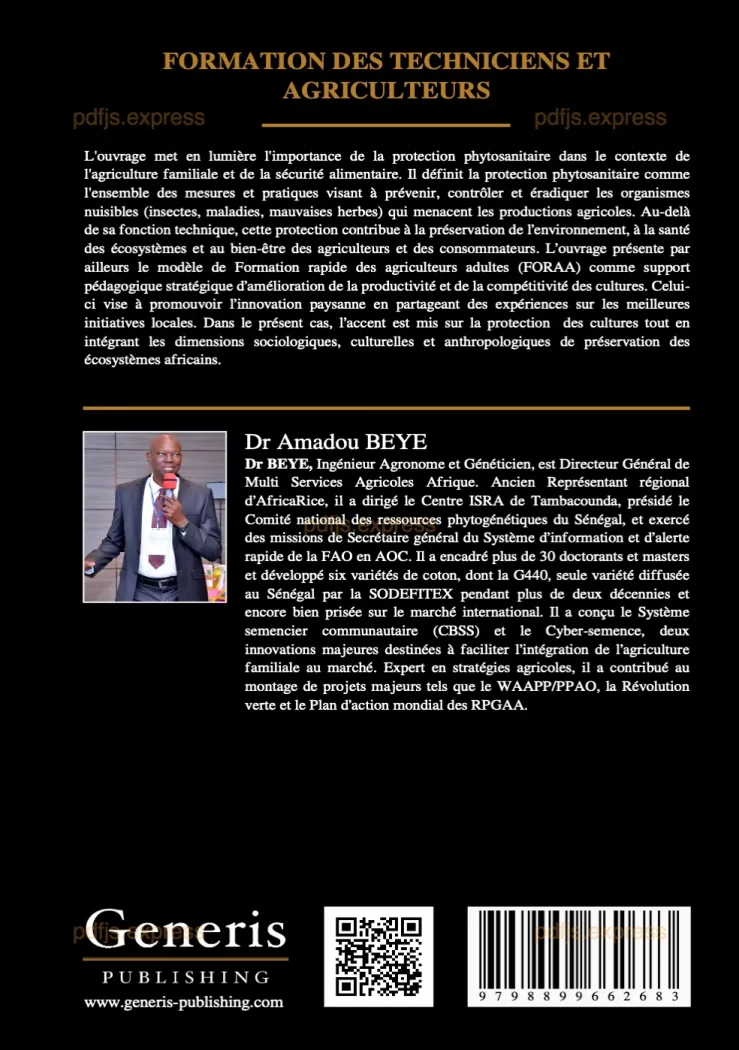 L’ouvrage met en lumière l’importance de la protection phytosanitaire dans le contexte de l’agriculture familiale et de la sécurité alimentaire. Il définit la protection phytosanitaire comme l’ensemble des mesures et pratiques visant à prévenir, contrôler et éradiquer les organismes nuisibles (insectes, maladies, mauvaises herbes) qui menacent les productions agricoles. Au-delà de sa fonction technique, cette protection contribue à la préservation de l’environnement, à la santé des écosystèmes et au bien-être des agriculteurs et des consommateurs. L’ouvrage présente par ailleurs le modèle de Formation rapide des agriculteurs adultes (FORAA) comme support pédagogique stratégique d’amélioration de la productivité et de la compétitivité des cultures. Celui-ci vise à promouvoir l’innovation paysanne en partageant des expériences sur les meilleures initiatives locales. Dans le présent cas, l’accent est mis sur la protection des cultures tout en intégrant les dimensions sociologiques, culturelles et anthropologiques de préservation des écosystèmes africains.