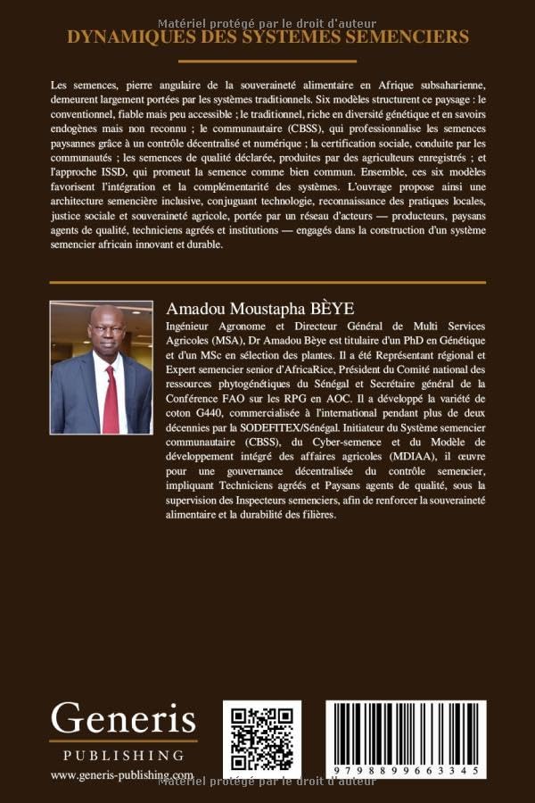 Les semences, pierre angulaire de la souveraineté alimentaire en Afrique subsaharienne, demeurent largement portées par les systèmes traditionnels. Six modèles structurent ce paysage : le conventionnel, fiable mais peu accessible ; le traditionnel, riche en diversité génétique et en savoirs endogènes mais non reconnu ; le communautaire (CBSS), qui professionnalise les semences paysannes grâce à un contrôle décentralisé et numérique ; la certification sociale, conduite par les communautés ; les semences de qualité déclarée, produites par des agriculteurs enregistrés ; et l’approche ISSD, qui promeut la semence comme bien commun. Ensemble, ces six modèles favorisent l’intégration et la complémentarité des systèmes. L’ouvrage propose ainsi une architecture semencière inclusive, conjuguant technologie, reconnaissance des pratiques locales, justice sociale et souveraineté agricole, portée par un réseau d’acteurs — producteurs, paysans agents de qualité, techniciens agréés et institutions — engagés dans la construction d’un système semencier africain innovant et durable.